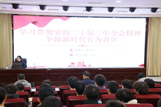 为深入学习贯彻党的二十大和二十届三中全会精神,落实省委宣传部、省委教育工委、省教育厅关于2024年领导干部上讲台开展思想政治教育工作要求,进一步推动党的创新理论进课堂、进头脑,2024年11月28日下午,学校党委委员、副校长滕文锐在学校B楼报告厅为beat365在线唯一官网学生代表讲授了《学习贯彻党的二十届三中全会精神 争做新时代有为青年》专题思政课。beat365在线唯一官网党政主要领导和部分教师同时参加了学习。
