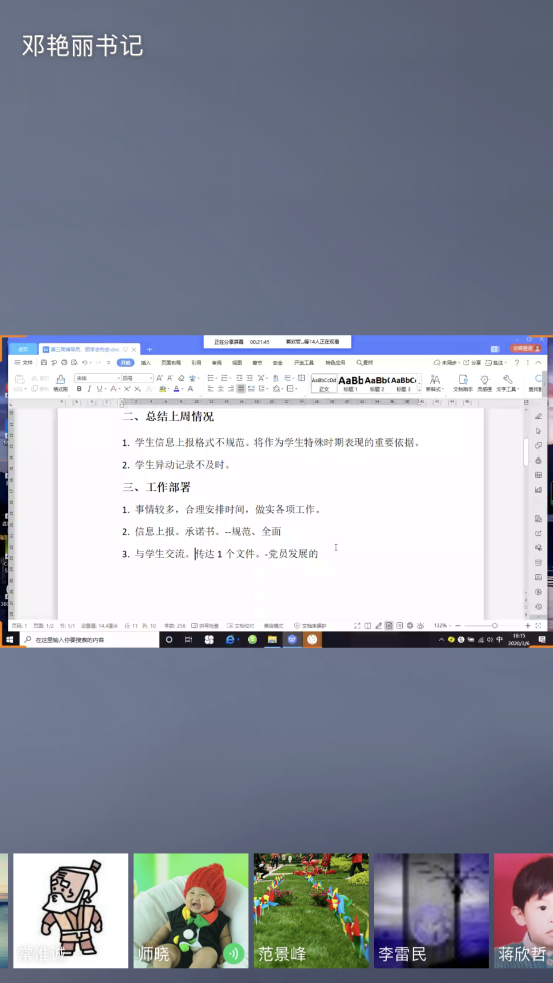第二环节:邓书记对下一阶段工作进行了部署和要求。1.持续做好疫情防控工作,调节好自己的生活。2.协助辅导员做好网络课程管理、健康排查和信息上报工作。3.持续做好与班级同学的沟通交流,逐步适应现在生活学习工作模式,将各方面的收获做到最大。