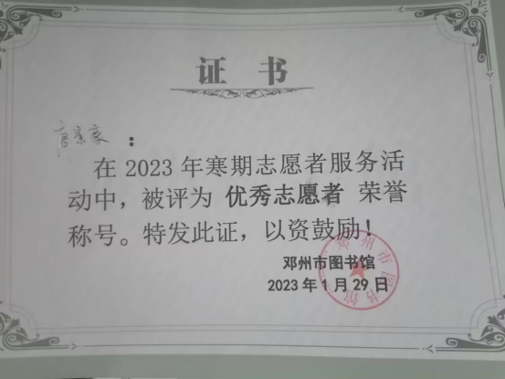 物联网2202班唐景豪同学在河南省邓州市图书馆进行了为期26天的社会实践,他主要工作是协助馆员整理书架,引导读者正确使用图书自助借还设备,协助工作人员规范读者不文明行为,打扫图书馆卫生等。