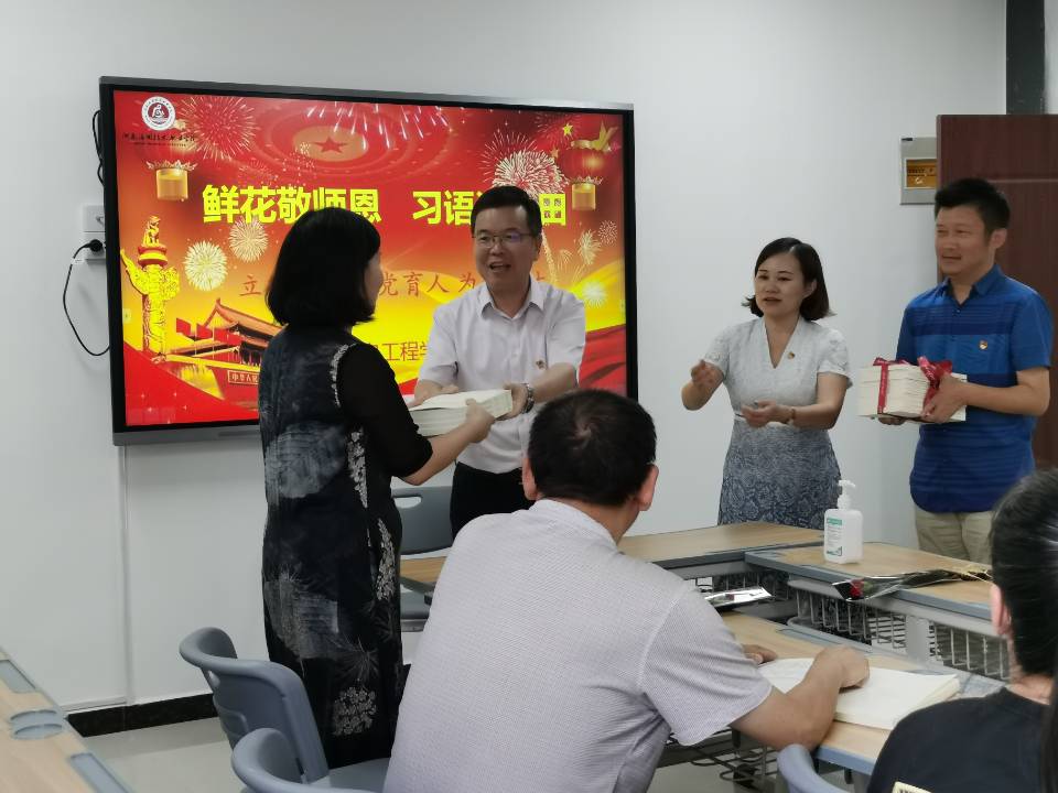 2020年9月10日,在第36个教师节来临之际,学校党委委员范晓伟校长在宣传部部长周燕的陪同下,到自己联系的beat365在线唯一官网党总支看望党员教师代表,代表学校送去对各位教师节日的祝福!并给大家送上了《习近平总书记教育重要论述讲义》,希望大家牢记教师初心使命,做“四有”好老师,为学校教育教学的发展做出贡献。并希望beat365在线唯一官网在教学方面不断创新,在各方面取得更大成绩。