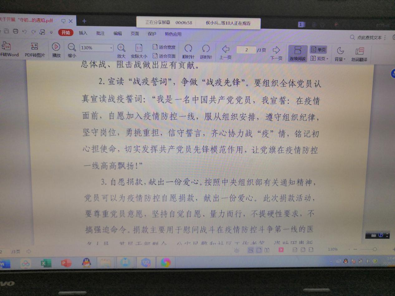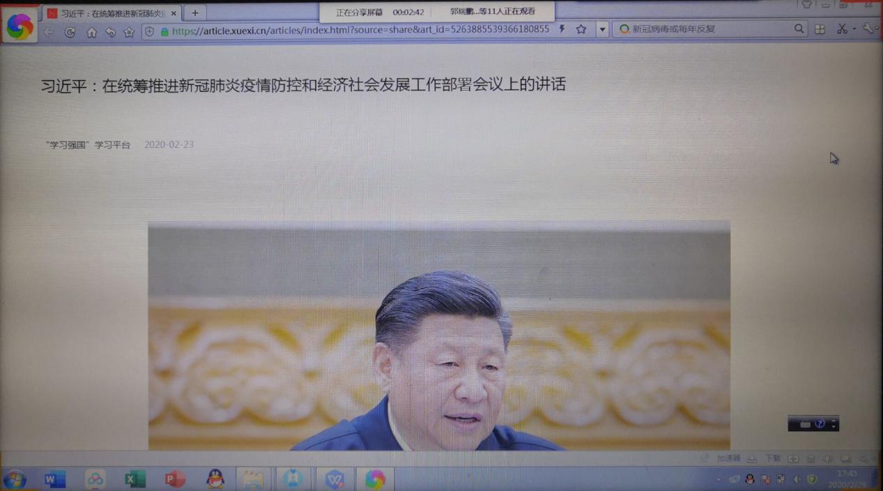 会议第一项,分别由党支部书记带领全体党员共同学习了《关于组织开展“守初心、献爱心、战疫情、做先锋” 线上主题党日活动的通知》和习近平总书记《在统筹推进新冠肺炎疫情防控和经济社会发展工作部署会议上的讲话》。通过学习,大家明确了我们党对统筹推进疫情防控和经济社会发展工作的具体办法,明确了习近平总书记在讲话最后对党员干部提出的三点要求,即要狠抓工作落实、要增强忧患意识、要提高工作本领。