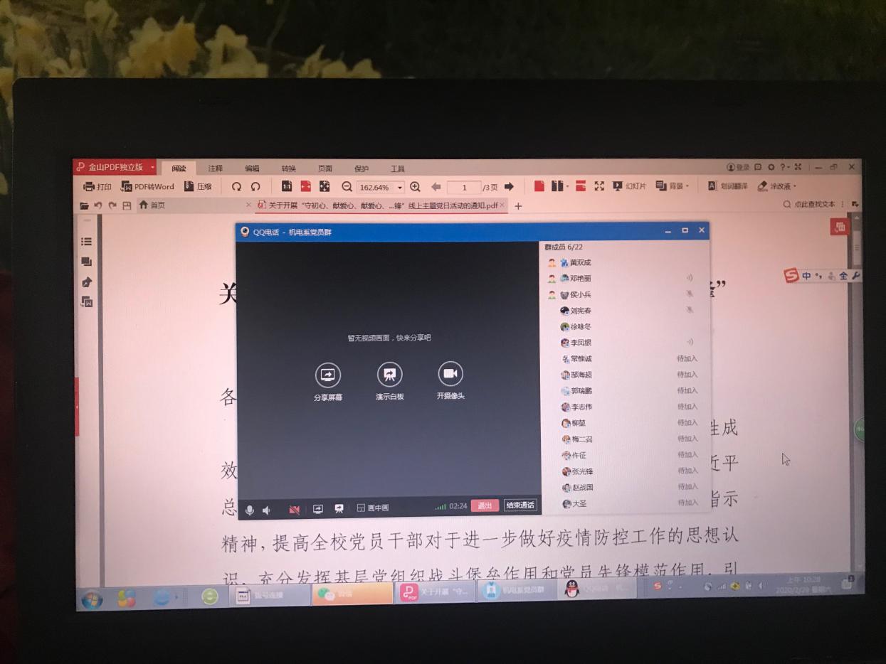 根据校党委组织部《关于组织开展“守初心、献爱心、战疫情、做先锋” 线上主题党日活动的通知》要求,beat365在线唯一官网党总支在2020年2月29日上午10点召开了总支委会,共同学习了通知要求,并对本次主题党日活动进行了部署。教工党支部和学生党支部分别于2020年3月1日下午3点和2月29日下午5点分别通过“叮叮”视频和qq群分享屏幕召开了“守初心、献爱心、战疫情、做先锋”线上主题党日活动,现总结如下:
