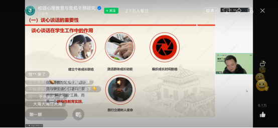 在课程内容中,李勤老师对辅导员谈心谈话工作要点进行了深入细致的剖析。他着重强调,谈心谈话绝非普通的日常交流,而是一门蕴含诸多专业技巧的学问。比如,建立信任关系时,辅导员要敏锐捕捉学生话语背后潜藏的情绪,以真诚的态度给予回应,让学生真切感受到尊重与理解。在营造谈话氛围上,一个亲切的微笑、一个恰当的肢体动作,都能有效舒缓学生的紧张情绪,促使他们敞开心扉。在助力心理中心协同合作方面,李勤老师指出,辅导员与心理中心应紧密配合,信息共享至关重要。辅导员凭借日常与学生的频繁接触,能够最早察觉学生的异常状况,而心理中心则具备专业的测评工具和资深的咨询团队。双方只有及时沟通,共同制定干预方案,才能为学生提供全方位、高质量的心理支持。